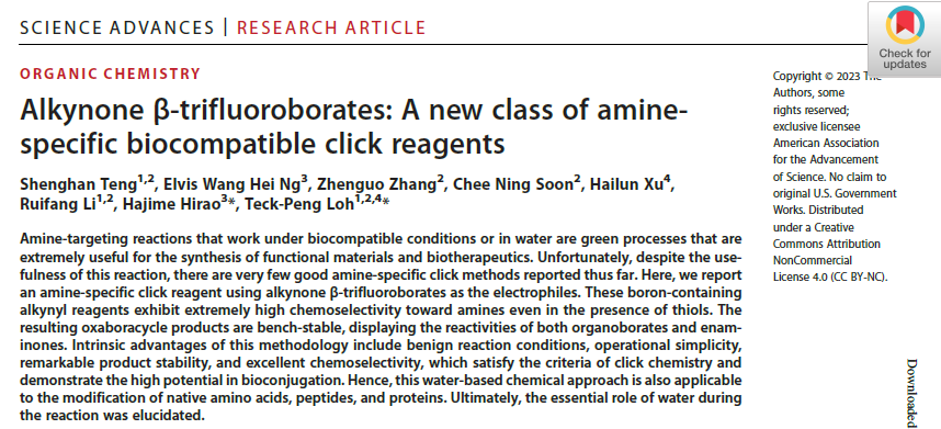近日,前沿交叉科学与技术学院(CAIST)罗德平院士团队及合作机构的研究人员在无金属“点击”技术方面取得了突破性进展,这种胺特异性且高生物兼容性的方法,将可能应用于化学生物学与生物医药等领域。该成果在Science子刊《Science Advances》杂志上发表:“Alkynone β-trifluoroborates: A new class of aminespecific biocompatible click reagents”(DOI: 10.1126/sciadv.adg4924)。罗德平院士为论文通讯作者,河南工业大学为论文的第一署名单位。