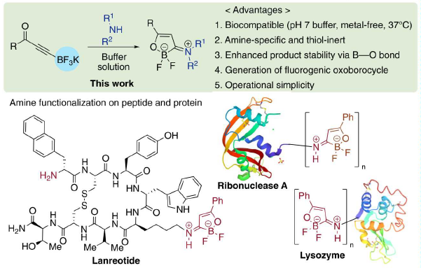 研究团队开发了一种炔酮β-三氟硼酸盐作为胺特异性“点击化学”试剂,并应用于1,4-共轭加成反应中。该方法具有高化学选择性且产物稳定等特点,通过官能团配位稳定有效抑制了副反应的发生,解决了其它方法的局限性。