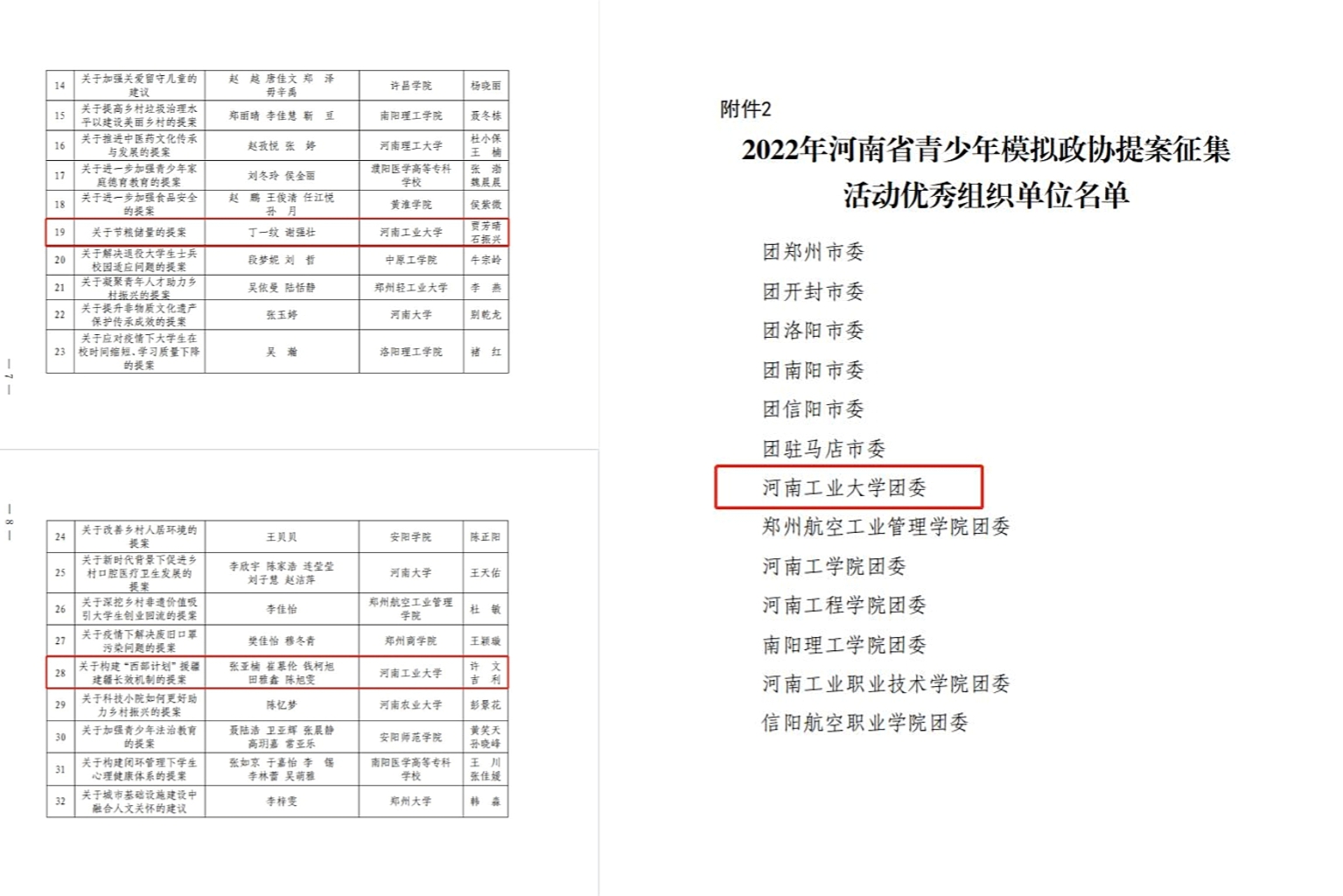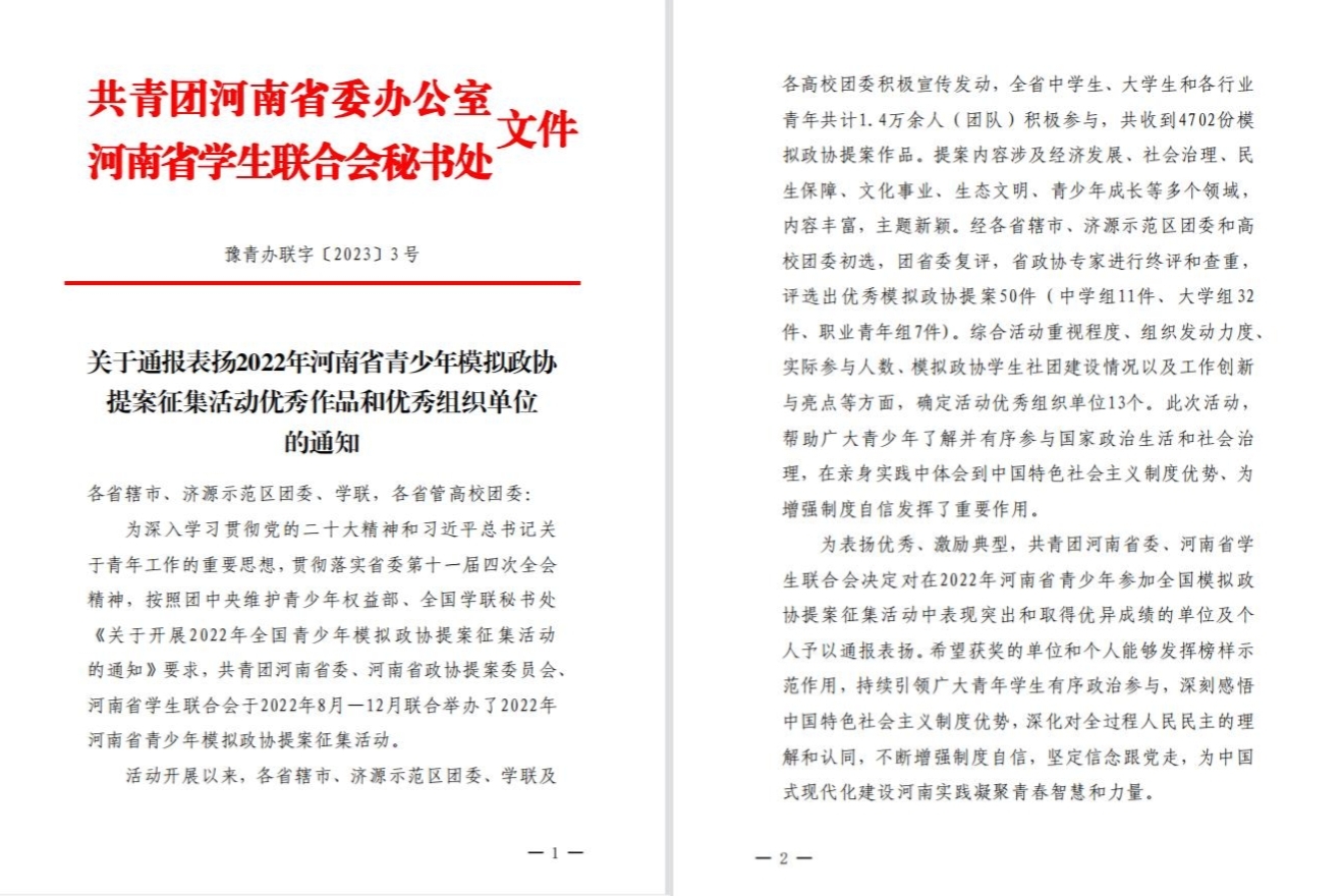 近日,为表扬优秀、激励典型,共青团河南省委、河南省学生联合会对在2022年河南省青少年参加全国模拟政协提案征集活动中表现突出和取得优异成绩的单位及个人予以通报表扬。我校团委荣获活动优秀组织单位,两件作品获评优秀,位全省前列。