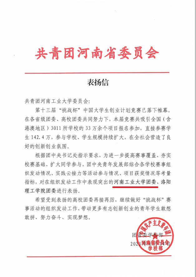 第十三届“挑战杯”中国大学生创业计划竞赛已落下帷幕。6月14日,我校收到表扬信。团中央青年发展部对在第十三届“挑战杯”竞赛组织发动工作中表现突出的学校进行表扬,河南省仅两所高校。