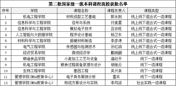 近日,教育部发布了《关于公布第二批国家级一流本科课程认定结果的通知》(教高函〔2023〕7号),我校共有12门课程被认定为国家级一流本科课程,其中线上线下混合式一流课程7门、线下一流课程4门、社会实践一流课程1门,课程清单如下: