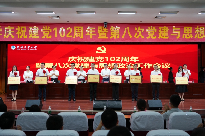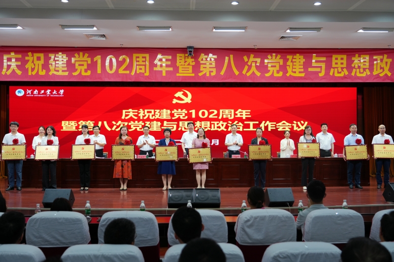 在庄严的国歌声中,会议拉开帷幕。会议首先对2021至2023年学校党建与思想政治工作中表现突出的单位及个人进行了表彰。校党委副书记周相寅宣读了《关于表彰2021-2023年度优秀共产党员、优秀党务工作者和先进基层党组织的决定》《关于公布“双带头人”教师党支部书记工作室建设单位的通知》《关于表彰“大学生党员标兵”的决定》《关于公布2023年度全省教育系统“两创两争”先进集体和先进个人评选结果的通知》《关于公布河南工业大学理论学习示范点创建单位的决定》《关于表彰河南工业大学思想政治工作优秀品牌的决定》《关于表彰河南工业大学思想政治工作先进个人的决定》等表彰文件。