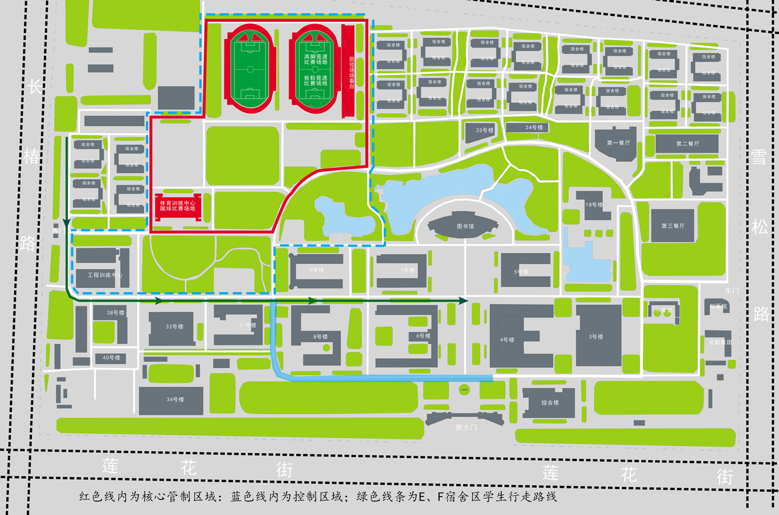 红色线内为核心管制区域;蓝色线内为控制区域;绿色箭头线为E、F宿舍区内学生往返教学区行走路线。